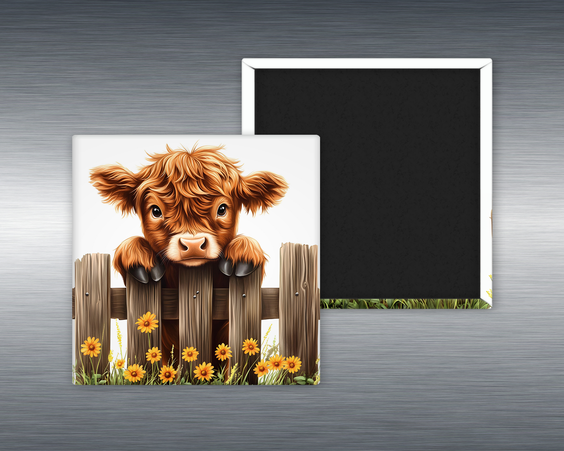 Meet the fluffiest fence-hoppers you’ll ever stick to your fridge! The “Baby Highland Cow” magnet features an irresistibly adorable baby Highland cow, peeking over wooden fences with curious eyes and tousled bangs. Their fuzzy faces and playful expressions bring a heart-melting dose of country charm to any magnetic surface.