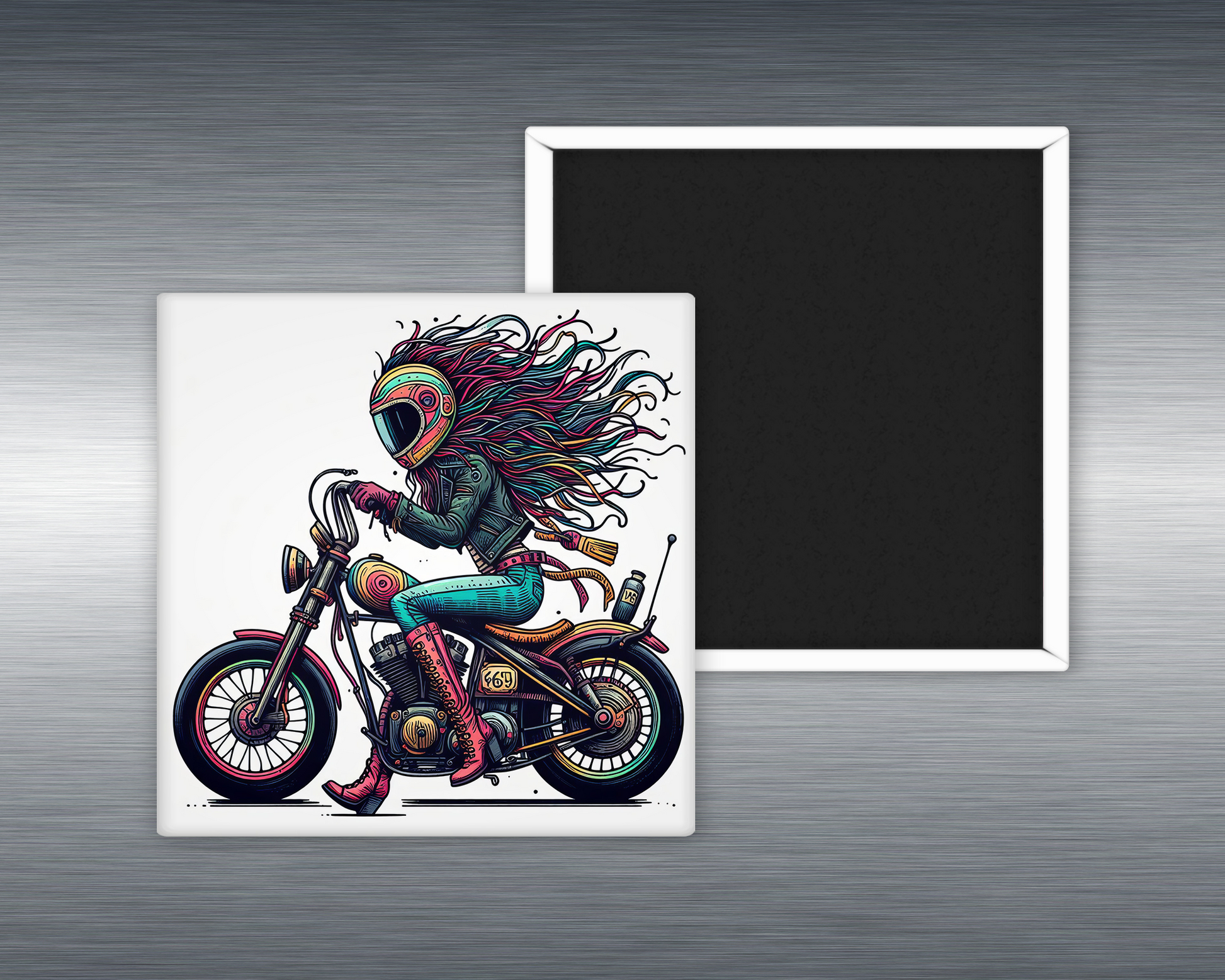 Power, attitude, and just the right touch of chaos—meet the “Eccentric Biker Girl” magnet, featuring a fierce biker who’s all leather, loud pipes, and zero apologies. With windswept hair, studded boots, and a fearless stare, she owns the road and your fridge with unapologetic style.