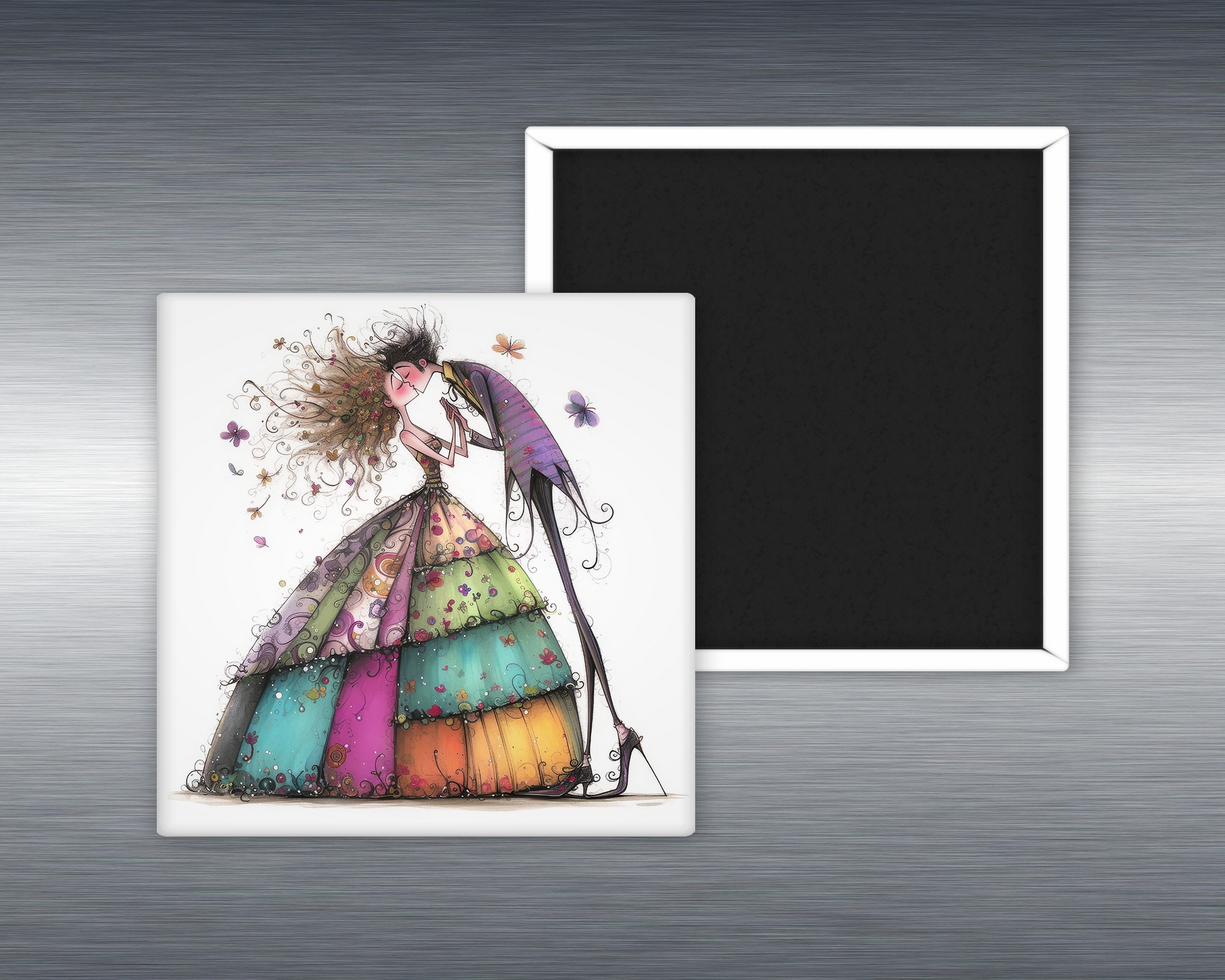 Bold. Offbeat. Unapologetically in love. Our “Eccentric Romantic Couple” magnet captures quirky couples in spontaneous, joy-filled smooches—proof that romance doesn’t need to follow the rules to be unforgettable. Whether they’re dressed in mismatched patterns, with funky hair, or wild colors, these lovebirds share kisses that are as expressive and unpredictable as they are.