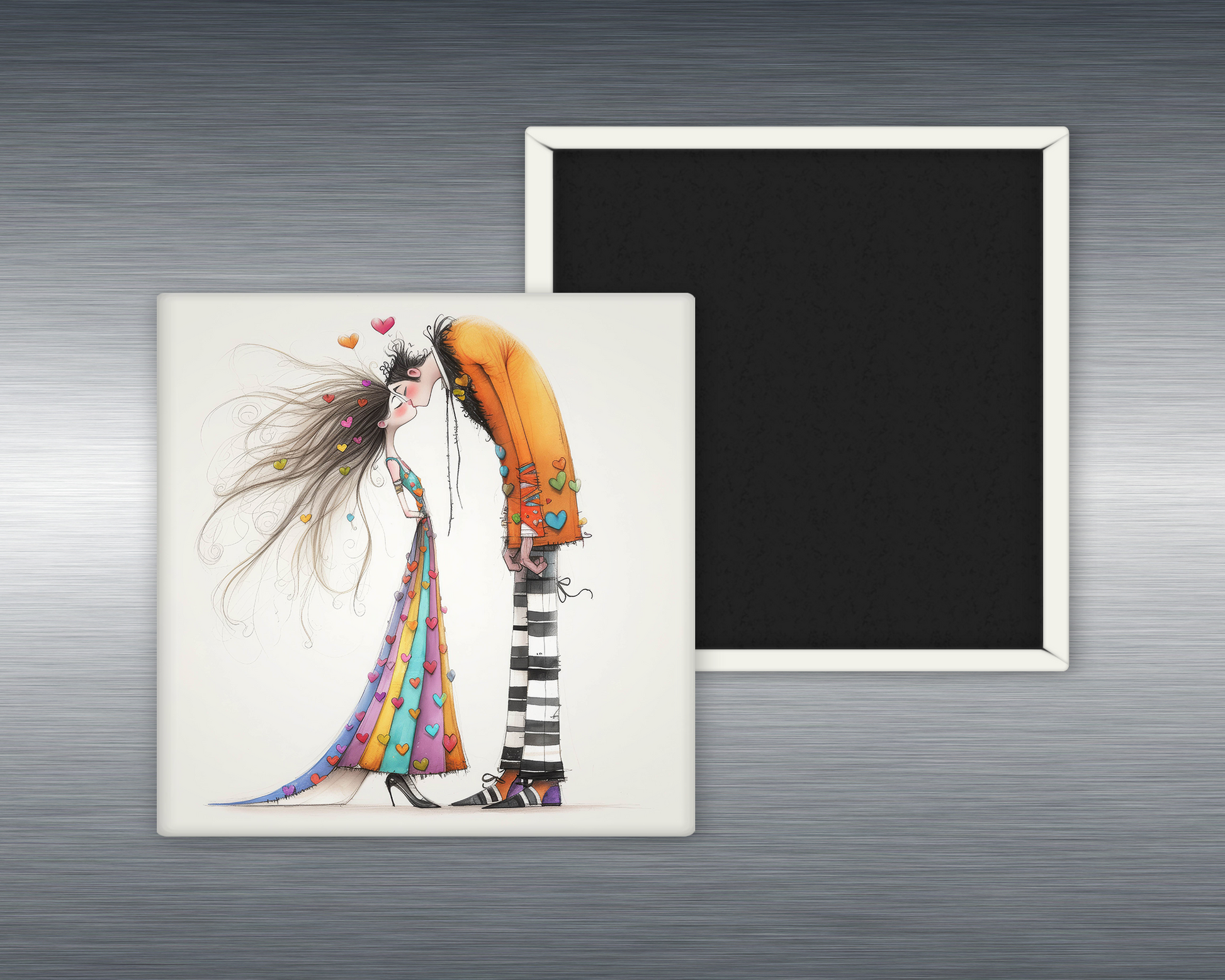 Bold. Offbeat. Unapologetically in love. Our “Eccentric Romantic Couple” magnet captures quirky couples in spontaneous, joy-filled smooches—proof that romance doesn’t need to follow the rules to be unforgettable. Whether they’re dressed in mismatched patterns, with funky hair, or wild colors, these lovebirds share kisses that are as expressive and unpredictable as they are.