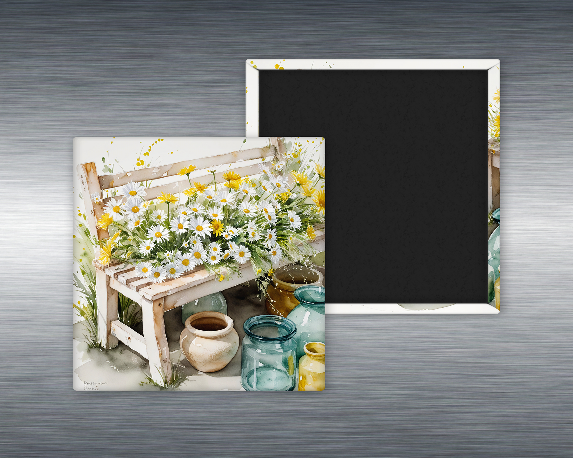 Simple. Serene. Sweetly nostalgic. The “Watercolor Daisies” magnet captures a peaceful moment in time—glass jars filled with cheerful daisies resting on weathered benches. With soft tones and rustic charm, this magnet brings a quiet touch of country beauty to your space.
