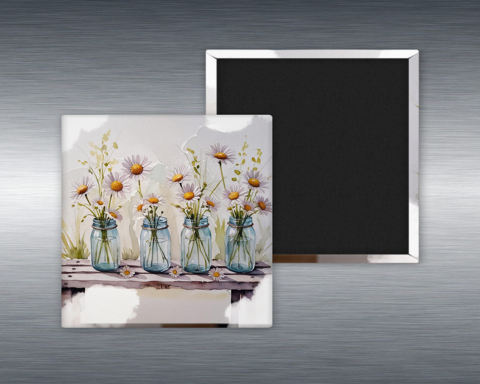 Simple. Serene. Sweetly nostalgic. The “Watercolor Daisies” magnet captures a peaceful moment in time—glass jars filled with cheerful daisies resting on weathered benches. With soft tones and rustic charm, this magnet brings a quiet touch of country beauty to your space.