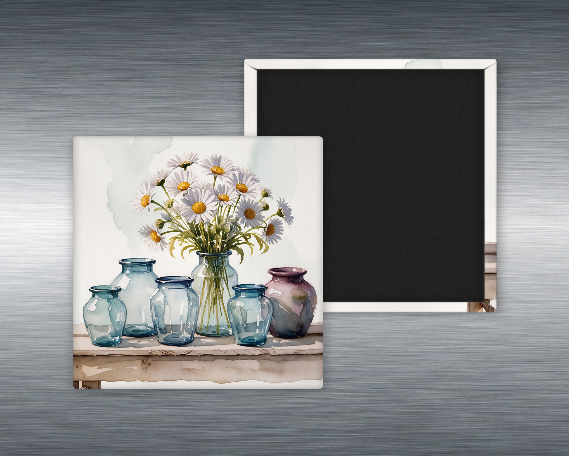 Simple. Serene. Sweetly nostalgic. The “Watercolor Daisies” magnet captures a peaceful moment in time—glass jars filled with cheerful daisies resting on weathered benches. With soft tones and rustic charm, this magnet brings a quiet touch of country beauty to your space.